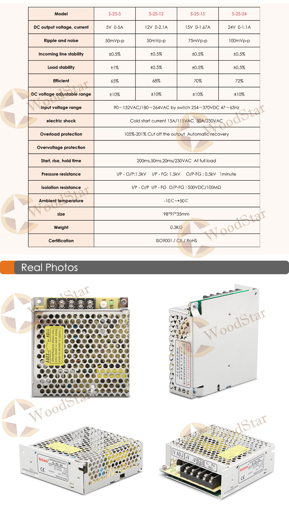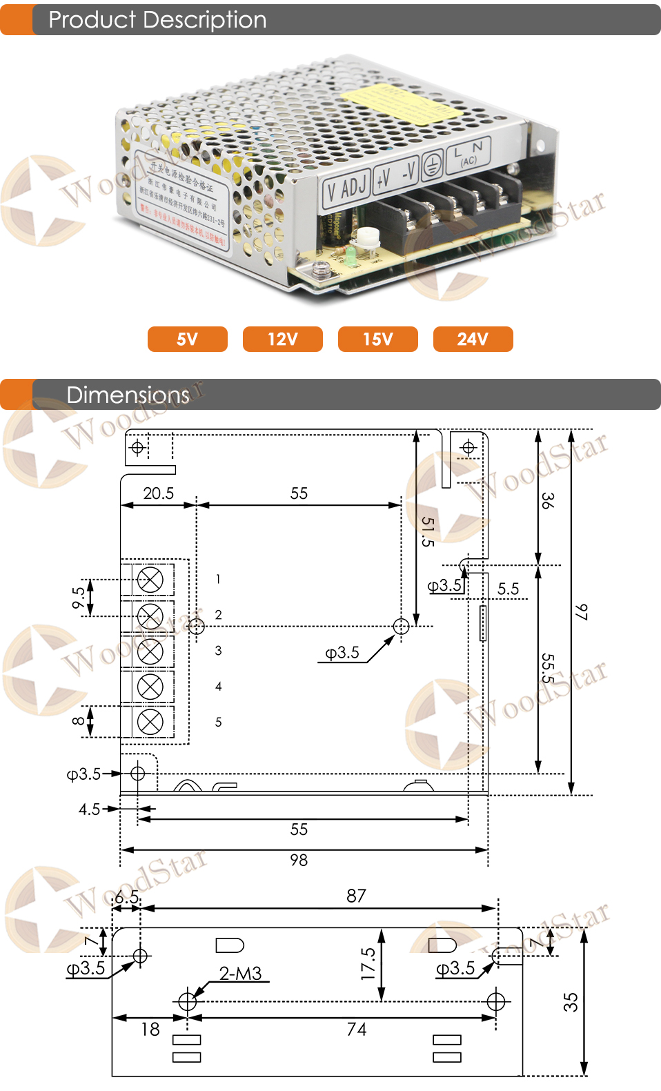 - 1 PCS x 25W 5V-5A/12V-2.1A/15V-1.67A/24V-1.1A Switching Power Supply